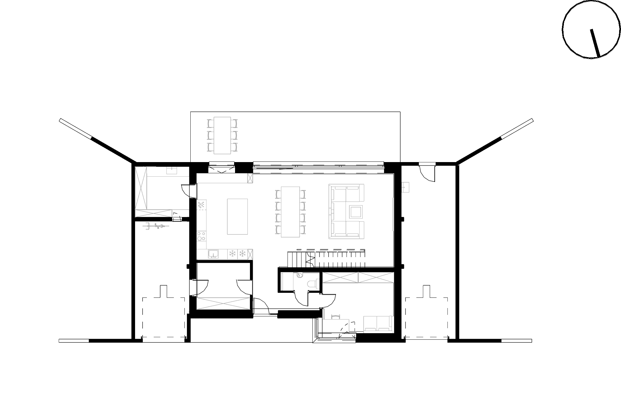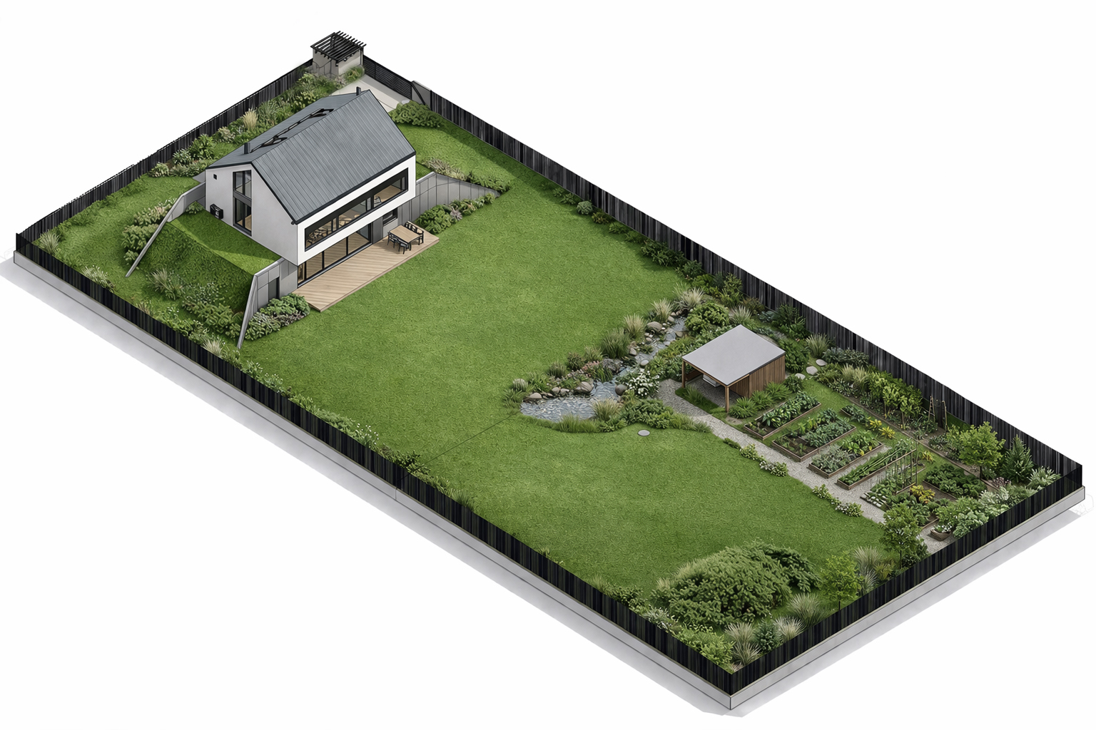 Dom ulokowałem w północnej części, tak aby garaż był ukryty i nie dominował widoku od wjazdu. Dzięki temu przed domem powstała szeroka otwarta przestrzeń. Główne pomieszczenia mogłem ustawić od południa, z dostępem do słońca przez cały dzień.