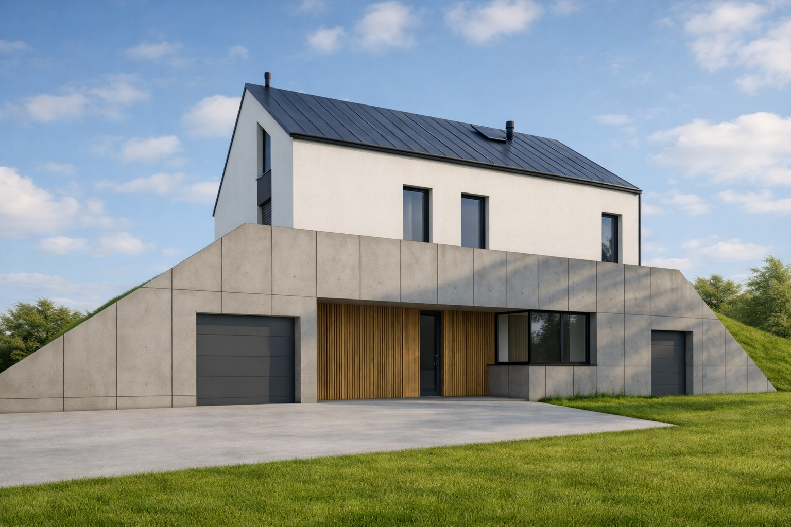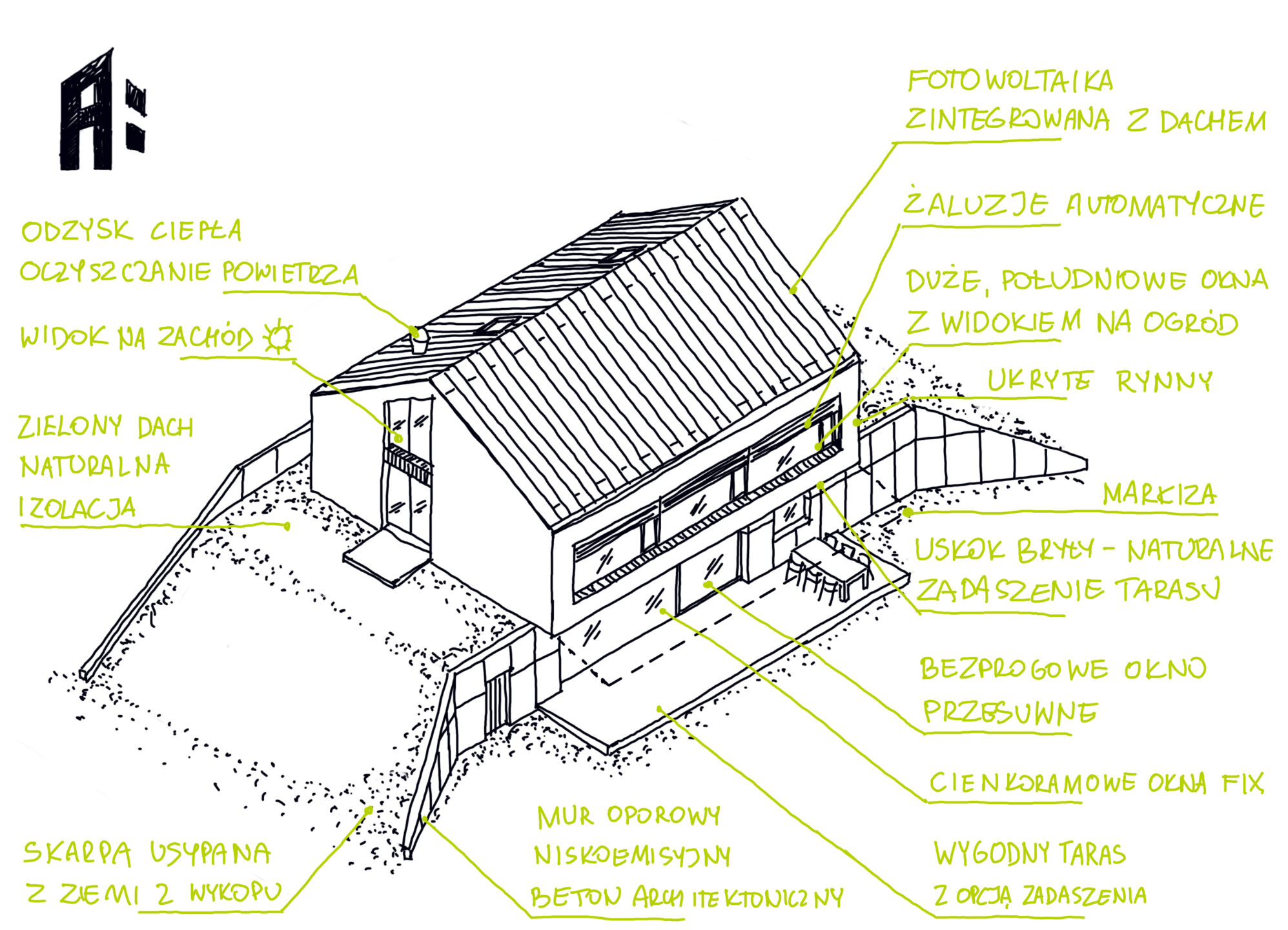 - pomieszczenia techniczne przysypane ziemią – pełnią funkcję naturalnej izolacji, temperatura w nich zimą praktycznie nie spada poniżej zera, więc pomagają też w bilansie energetycznym domu,