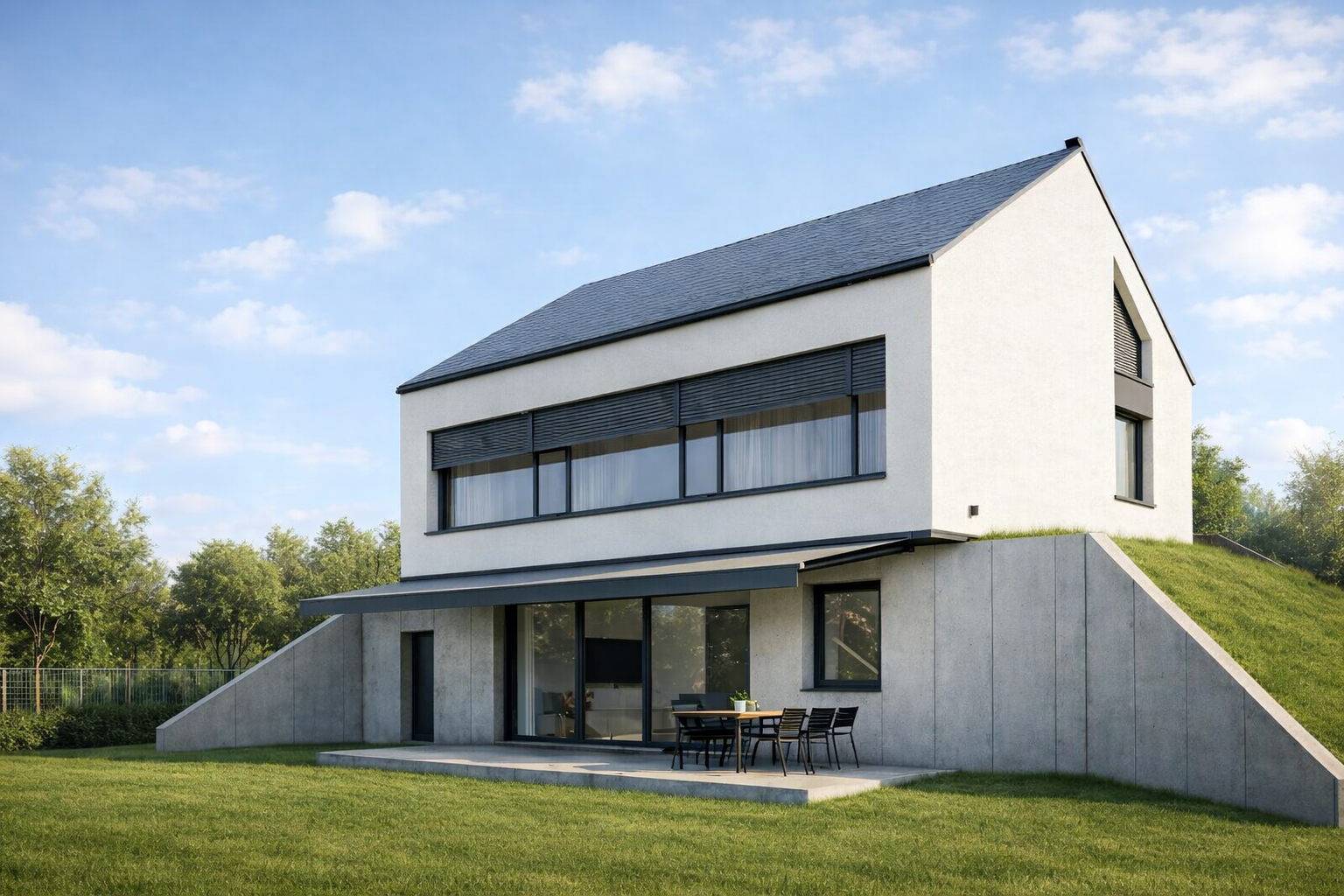 Dzieci są już duże. Nie zakładamy, że będą mieszkać z nami długo, ale chcemy, żeby miały miejsce, do którego będą mogły wracać, również z partnerami. Od południa zaplanowaliśmy duży taras z możliwością zadaszenia markizami. Lekkie wygięcia ściany betonowej osłaniają taras przed wiatrem ale nie zasłaniają słońca.