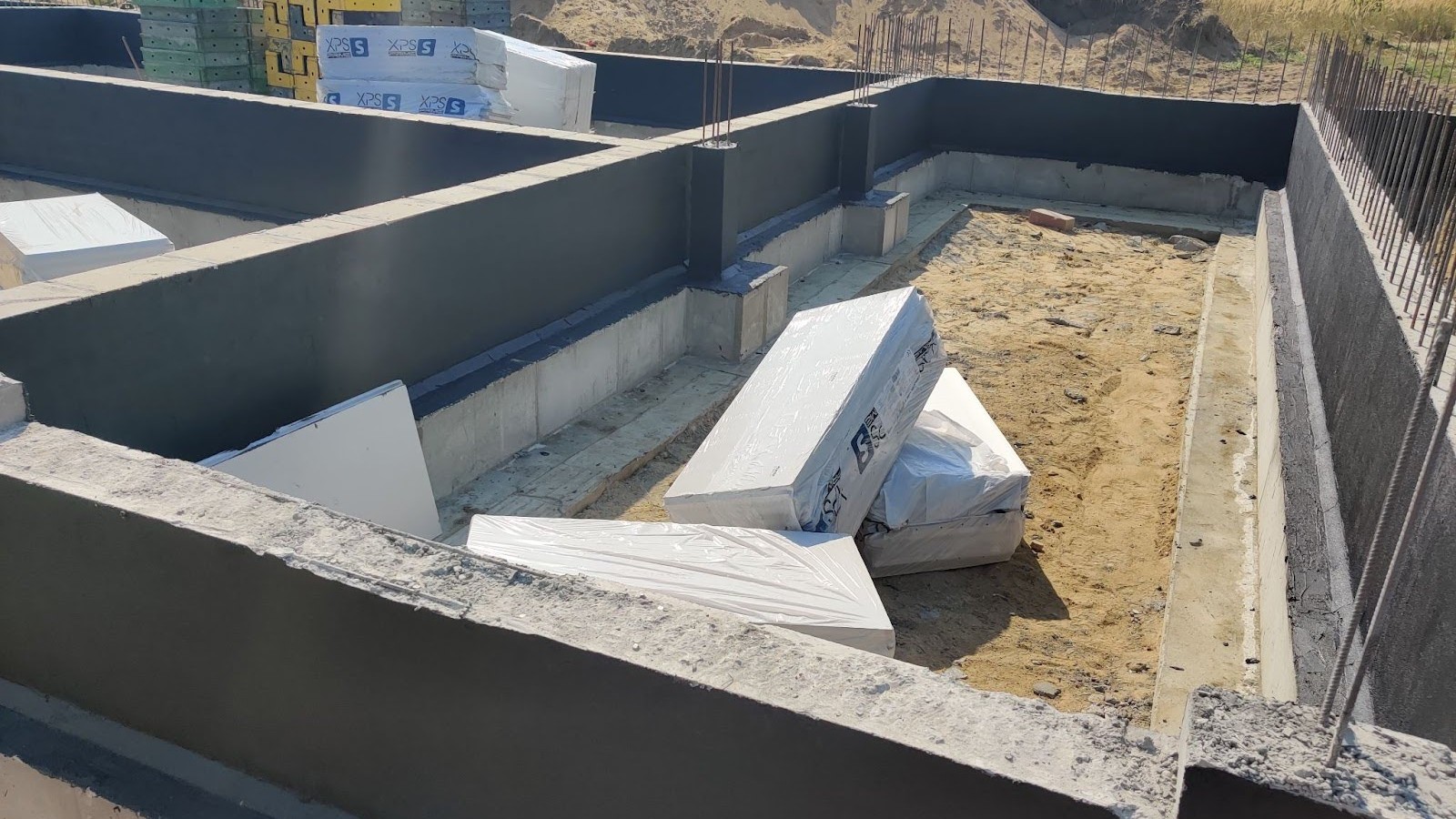 Całość zabezpieczono folią kubełkową, ułożoną kubełkami w stronę gruntu – o czym warto wspomnieć, bo na budowach często robi się to źle. Folia kubełkowa ma za zadania odprowadzenie wody, zabezpieczenie izolacji termicznej przed uszkodzeniami mechanicznymi i deformacją przy zasypywaniu fundamentów.