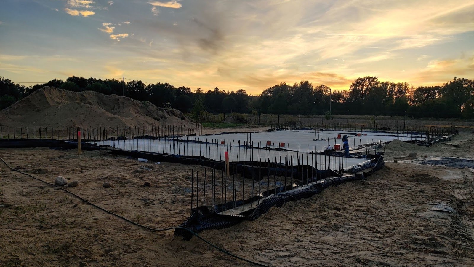 Dna wszystko zostało zalane chudym betonem. Tym samym zakończyliśmy etap stanu zero. Niepozorny efekt, ale to właśnie te „roboty zanikające” tworzą solidny fundament całego domu. O zachodzie słońca, na działce, to pięknie wyglądało.