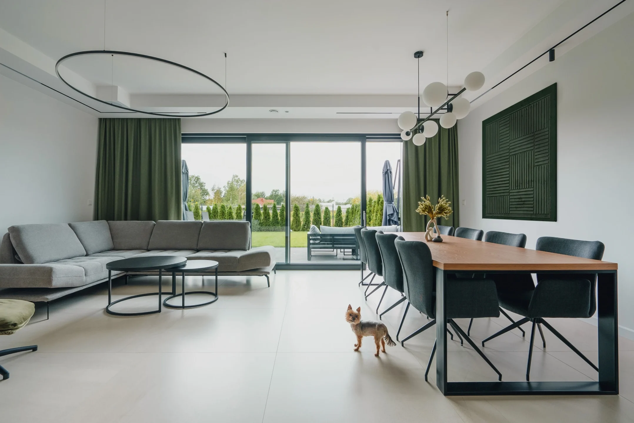 - Kombinacja opraw ściennych na różnych poziomach wizualnie łączy przestrzeń